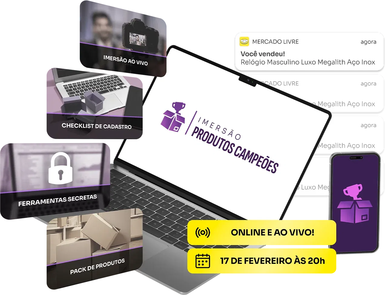 A Imersão Produtos Campeões é um workshop intensivo que ensina os 4 pilares essenciais para identificar e venderprodutos campeões no Mercado Livre. Com um método prático e comprovado, você aprenderá como transformarseu negócio em uma máquina de vendas diárias.